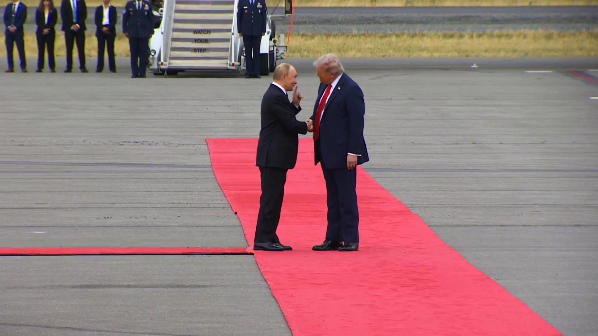 稍早时候,特朗普和普京各自的专机相继抵达埃尔门多夫-理查森联合军事基地的机场。11时许,特朗普和普京先后走下舷梯。特朗普在红毯上迎接普京并握手寒暄。红毯两侧各停放两架美军F-22隐形战斗机。